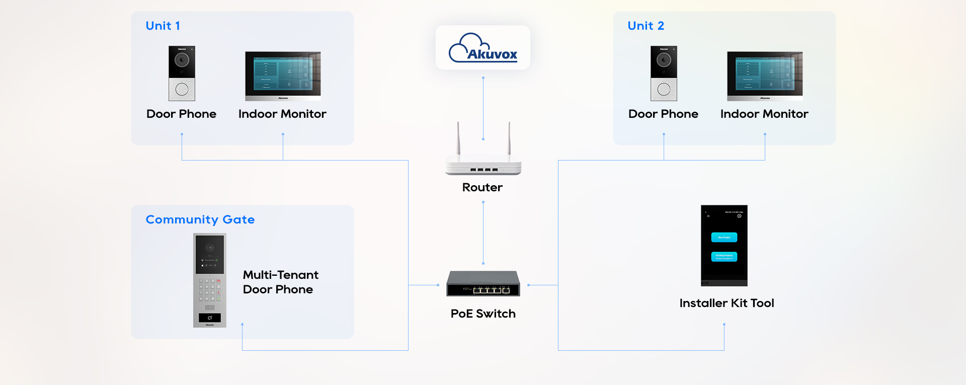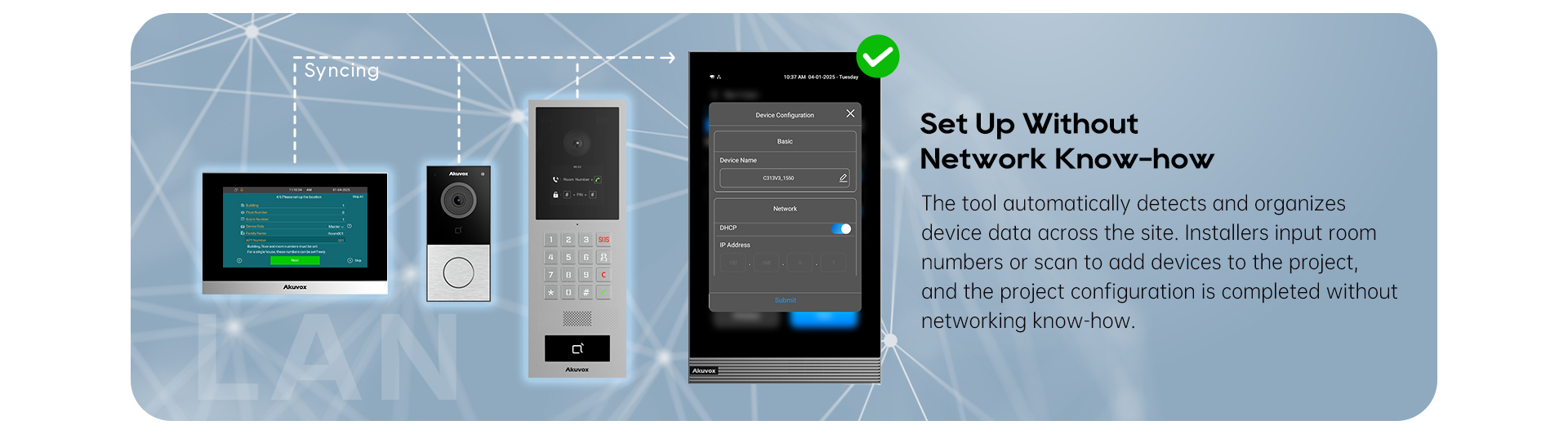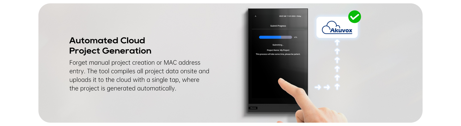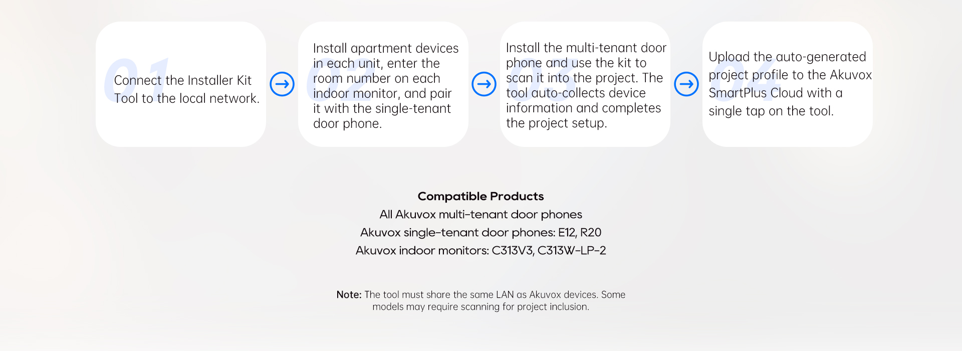The Akuvox Installer Kit Tool greatly simplifies multi-tenant intercom system setup and project configuration for installers. Built on S563W hardware with PoE and Wi-Fi support, it auto-collects device network info and auto-uploads projects to the cloud. Even without networking knowledge, deploying Akuvox smart intercoms is quick and easy.
