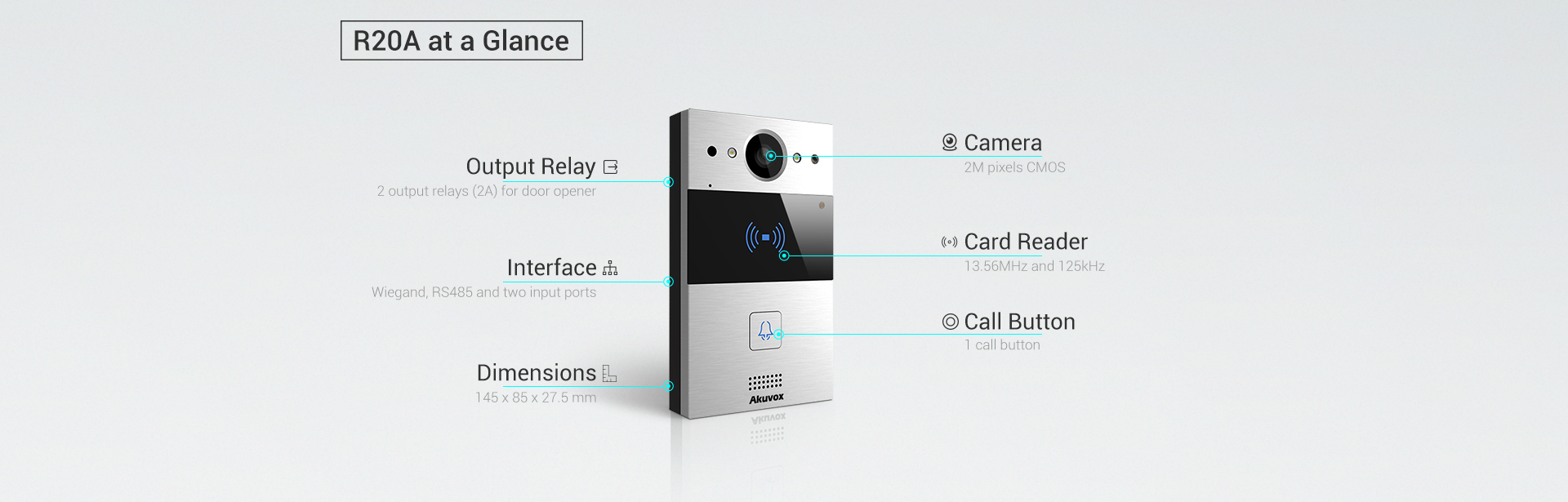 R20A-In-Wall | – Silver Aluminum Alloy Front Panel – 1 camera – Physical Numeric keypad – 13.56MHz & 125kHz RF Card Reader – PoE – Flush Mount – IP65 |
