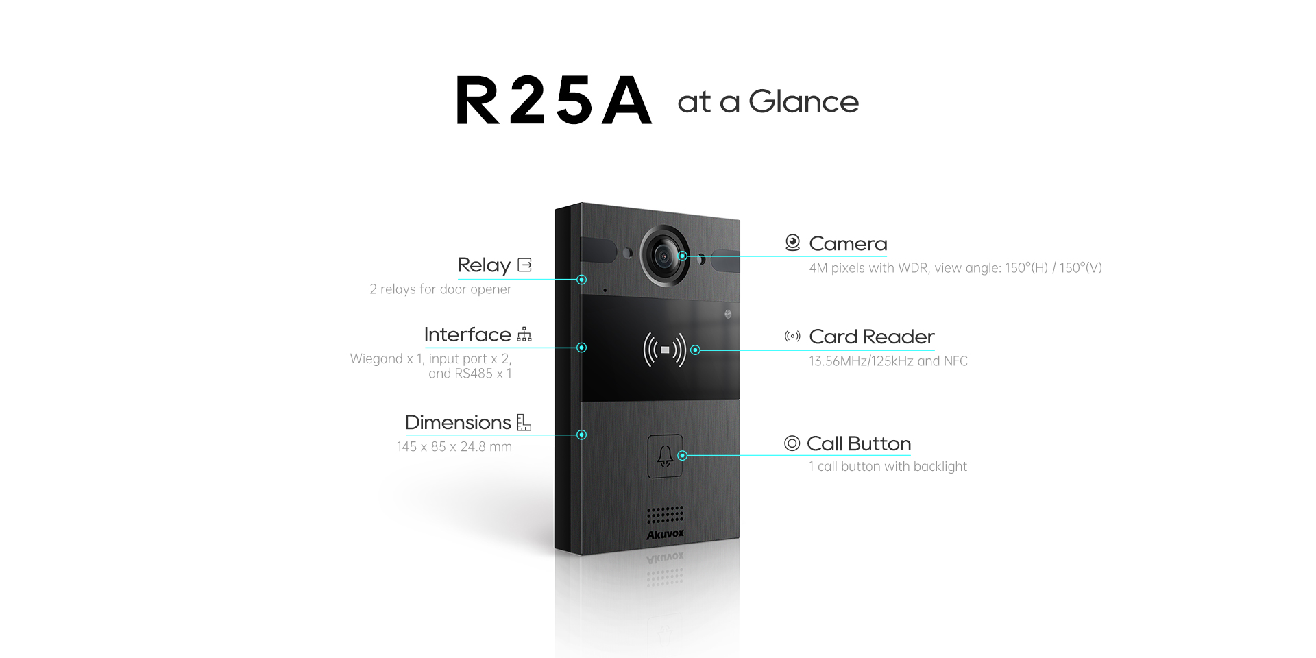 R25A-In-Wall | – 1 Fisheye Lens Camera – 13.56MHz & 125kHz RF Card Reader – PoE – Flush Mount – IP65 |